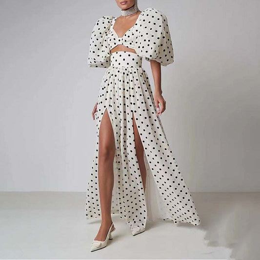 Woman Summer Dress Elegant, Square-neck Puff Sleeve Polka Dot Printed Dress Suit